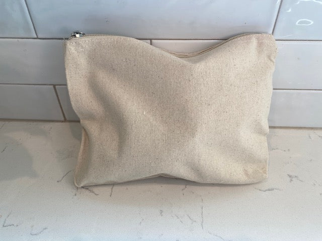 Beige Canvas Zip top 8.75 x 6.75 Flat pouch with the saying:
