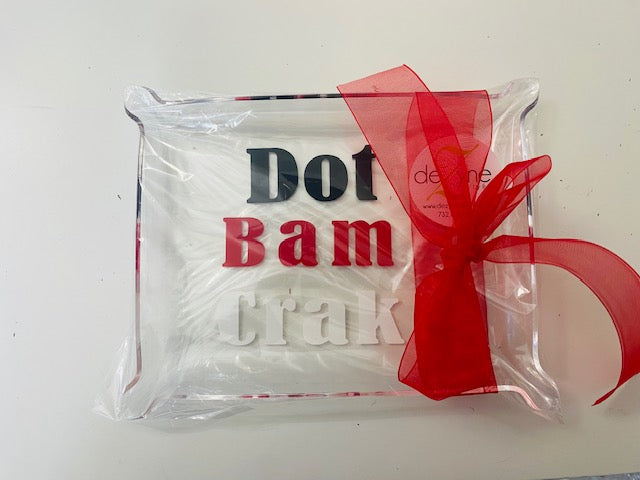 DOT... BAM... CRACK in vinyl lettering. Tray good for dry snacks only hand wash.
